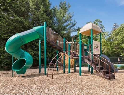 The children's play area, located behind the clubhouse parking lot, has slides, a rock wall, and a smaller structure for younger children. Please be respectful of other residents while playing.